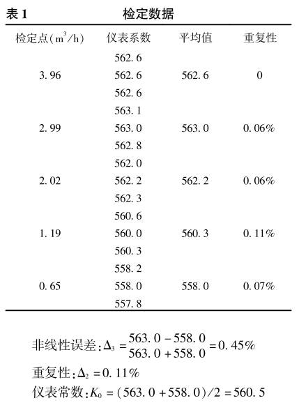 2)在滿足特定原則條件下,若流量計(jì)能夠定點(diǎn)使用(使用該點(diǎn)下的儀表系數(shù)平均值來替代儀表常數(shù)),則儀表常數(shù)的非線性誤差便可忽略。流量計(jì)的使用精度為δ=[(0.12+0.112)1/2]%=0.15%。