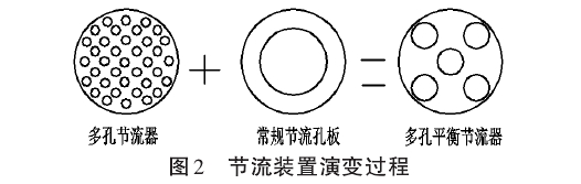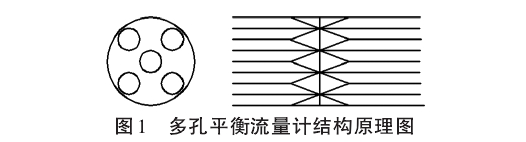 節(jié)流器原理是在常規(guī)的孔板節(jié)流板中心一個圓孔的基礎(chǔ)上結(jié)合多孔節(jié)流器的特點,組成對稱分布擁有數(shù)量不等的函數(shù)孔,當(dāng)介質(zhì)流過圓孔時,流體被平衡調(diào)整,渦流被最小化,形成近似理想流體,通過取壓裝置和變送器,可獲得穩(wěn)定的差壓信號,如圖2所示。