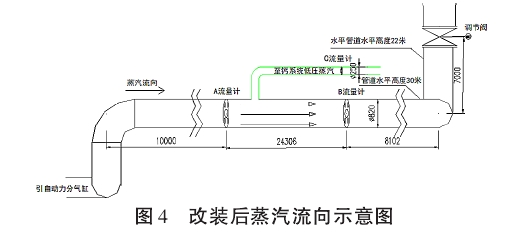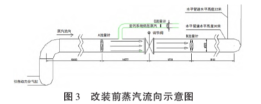 多孔平衡流量計的管道介質(zhì)蒸汽來自動力車間分氣缸(如圖3所示),主管道經(jīng)過沿路8m高的支架爬升至車間廠房30m高的樓頂,再由樓頂直管段引入NaCl與2H2O.CaCl2各系統(tǒng)。經(jīng)查驗流量計安裝嚴格按照設(shè)計院的設(shè)計要求,滿足直管段前3DN后1DN的距離要求。